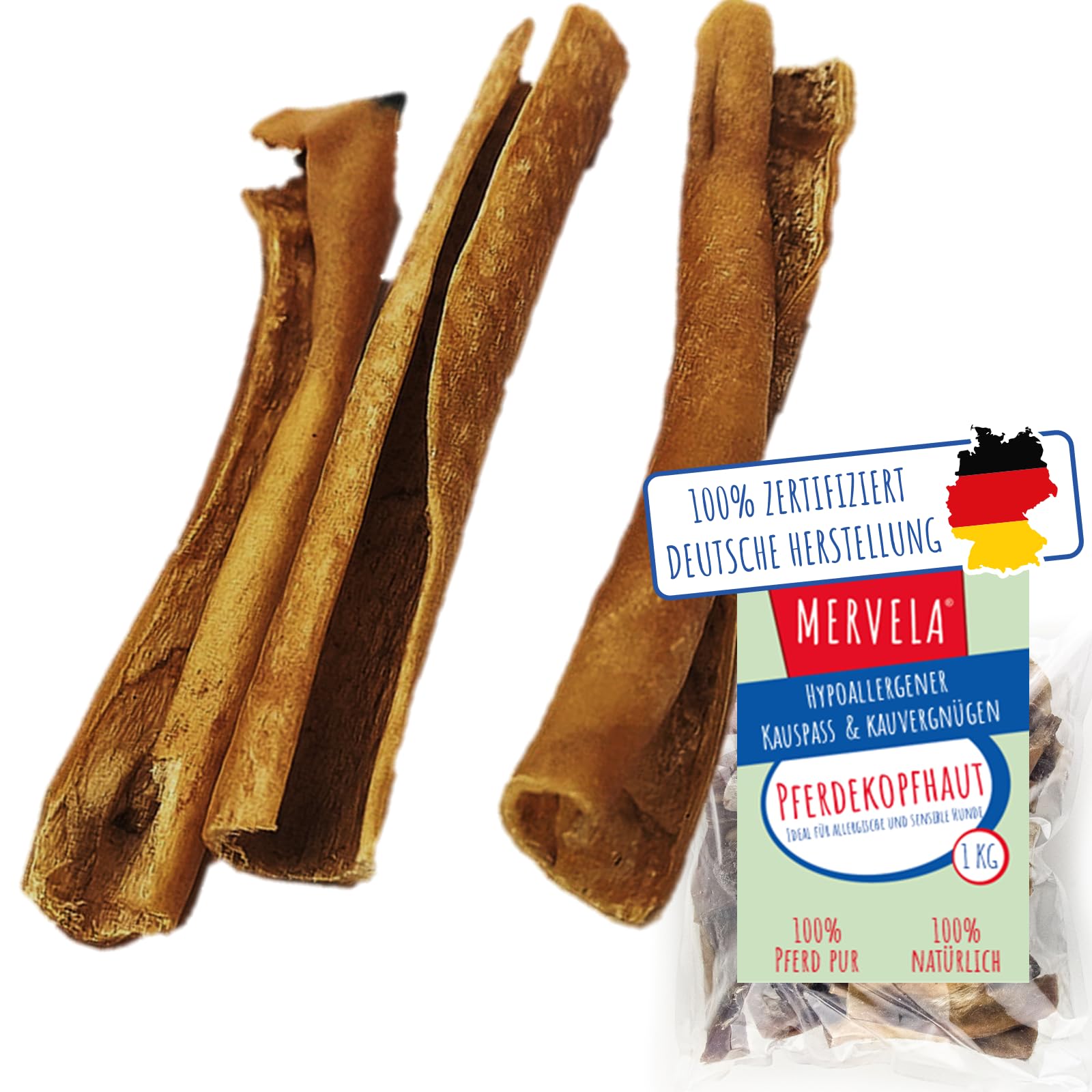 MERVELA Pferdekopfhaut ohne Fell | 100% Pferd | 1 kg | Qualität aus Deutschland | 12 cm Stücke | Pferde leckerlies | ideal für hypoallergene allergische Hunde