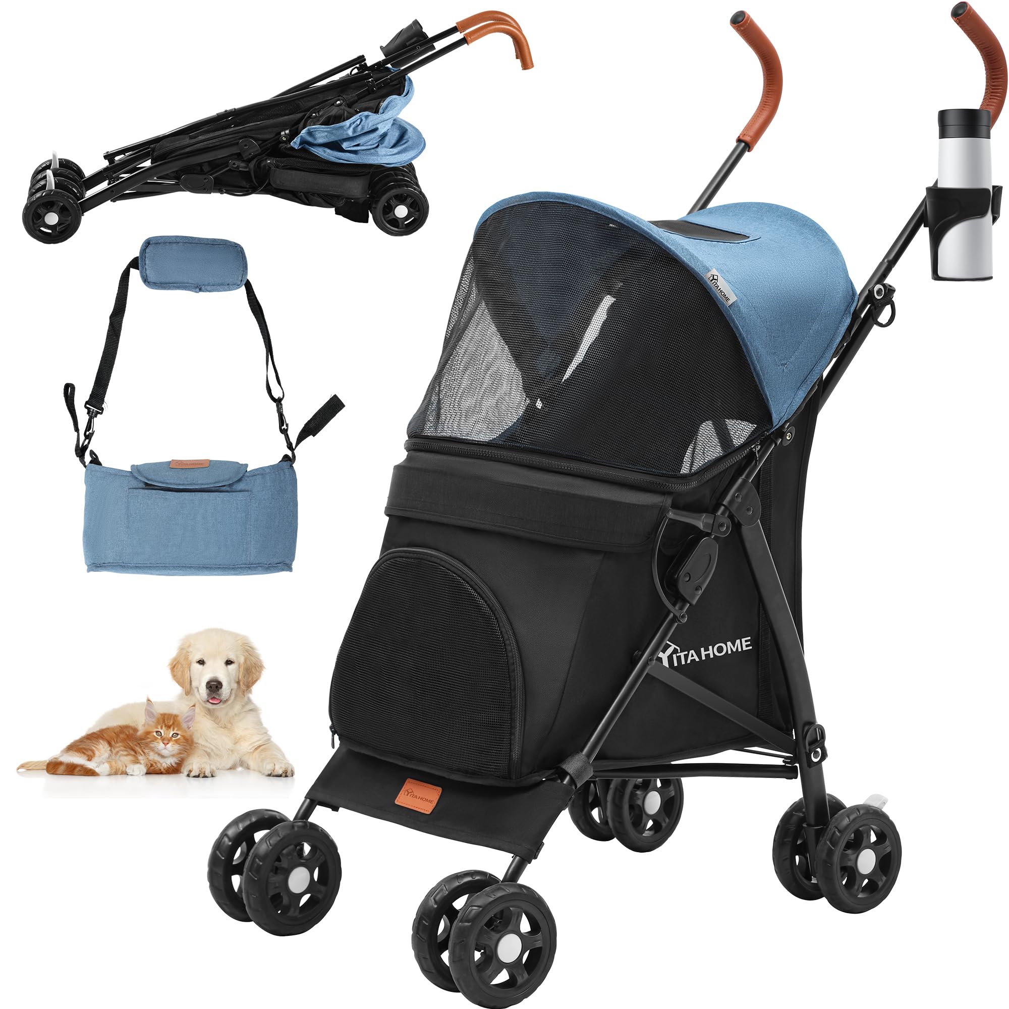 YITAHOME Tragbarer Hundebuggy, Hundewagen bis 11.3 kg, Faltbar klappbar, Haustiere Buggy mit Netzfenstern, Jogger Katzenbuggy für kleine Hunde Katzen, Haustier-Kinderwagen (Blau Schwarz)