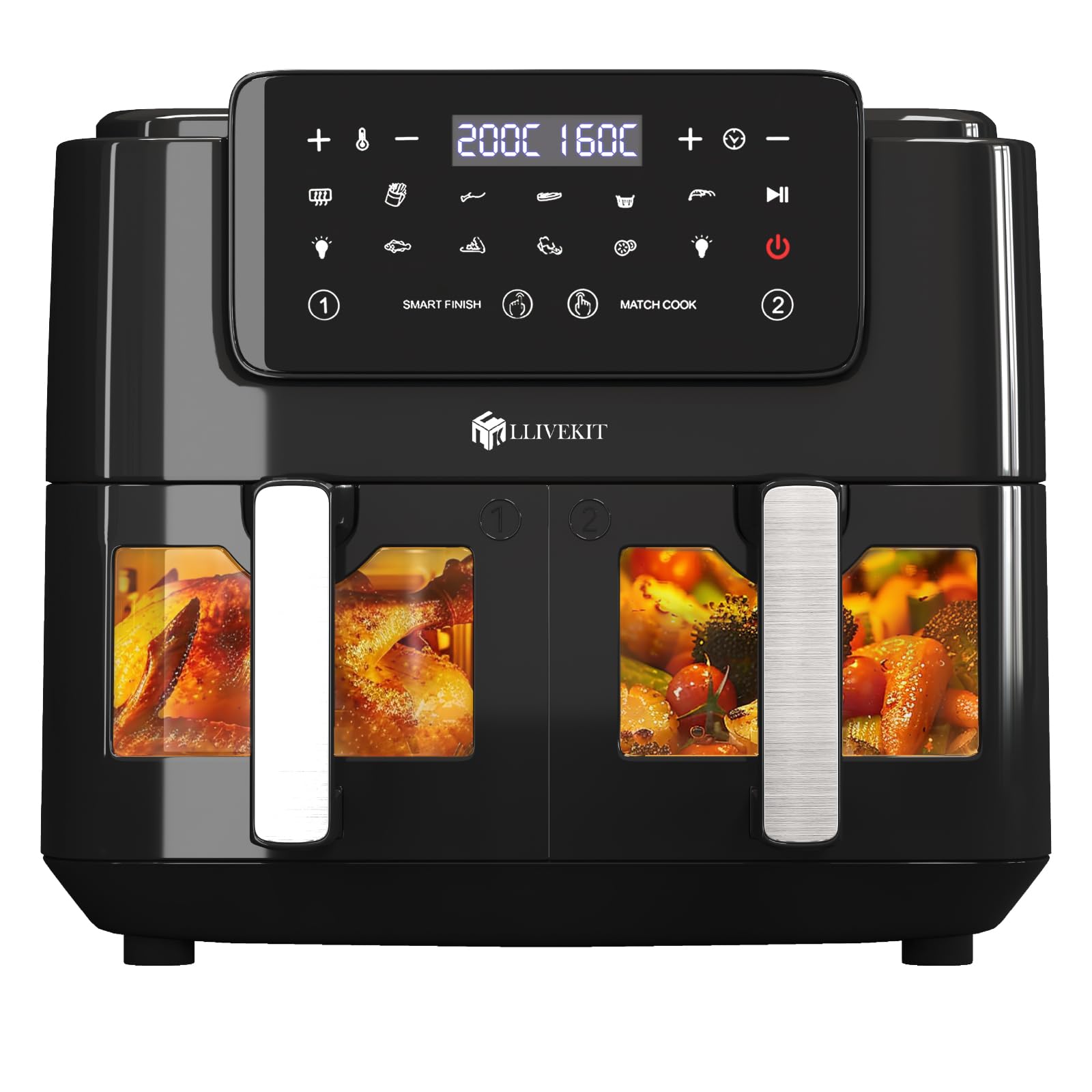 LLIVEKIT 9L Heißluftfritteuse 2 Kammern mit Sichtfenster, Backofen XXL ohne Öl, Airfryer 9-in-1, Heißluft-Backofen mit Touchscreen, Timer-Funktion