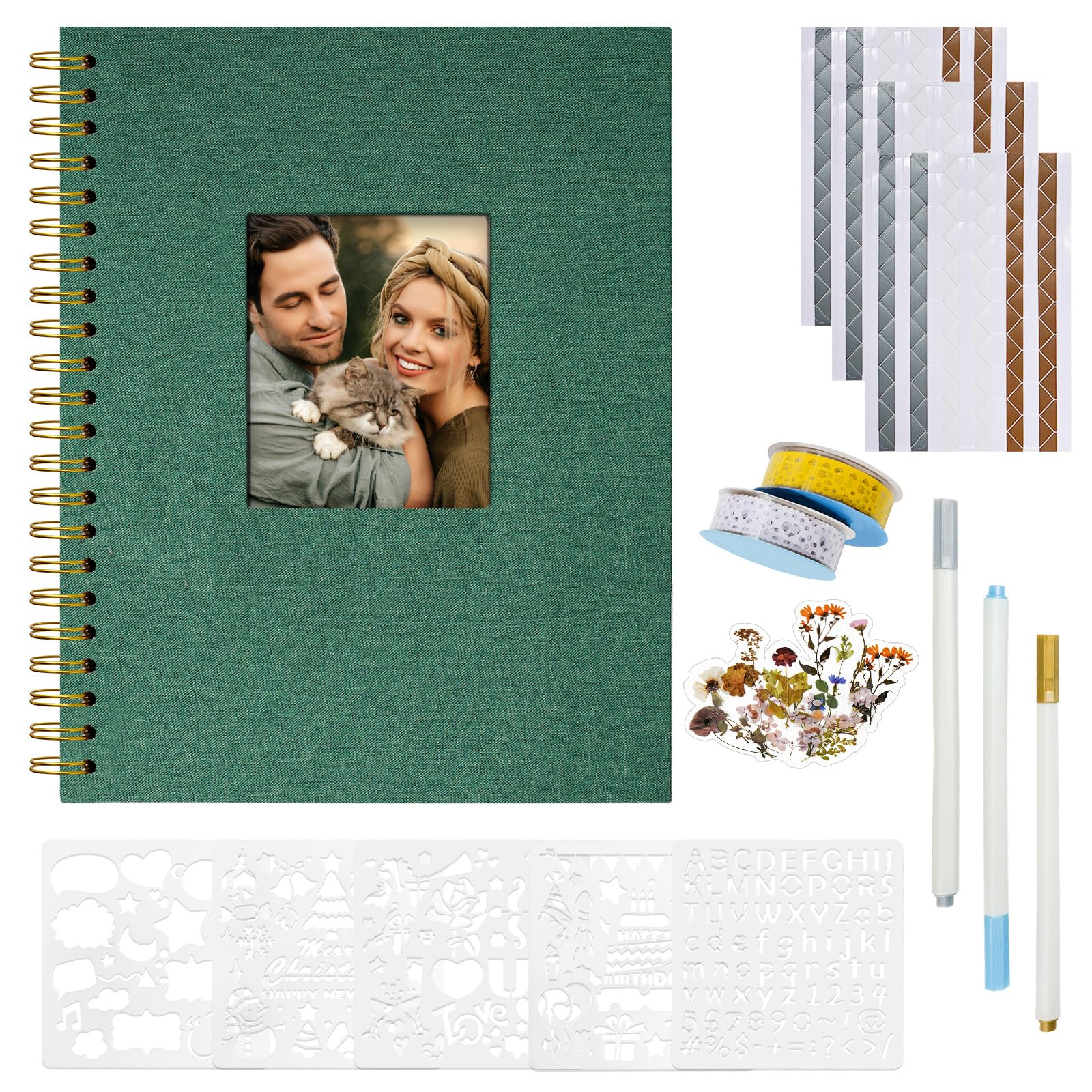 Vienrose Fotoalbum zum Selbstgestalten 28,5 x 20,5 cm, Leinen Fotoalbum mit 80 Weißen Seiten, Leeres Kraftpapier, DIY Scrapbook Spiralalbum Set für Babys, Familien, Hochzeiten, Jahrestag, Dunkelgrün
