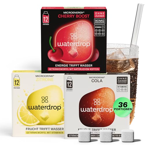 waterdrop® Soda Set – 36 zuckerfreie Drops mit prickelndem Cola, Kirsch & Zitronen Geschmack – vitaminreicher Durstlöscher – spritzige Alternative zu Limonade, Sirup, Getränkepulver & Flavour Drops