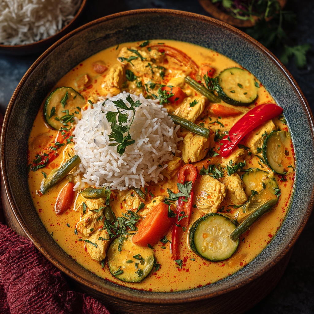 Wenn draußen die Blätter fallen, bringt dieses Curry die Sonne zurück auf den Teller. Cremige Kokosmilch, aromatische Gewürze und frisches Gemüse wie Kürbis, Möhren und Paprika verbinden sich zu einem wärmenden Herbstgericht. Serviert mit duftendem Basmatireis entsteht ein exotischer Wohlfühlmoment, der perfekt in die goldene Jahreszeit passt – würzig, bunt und voller Energie.