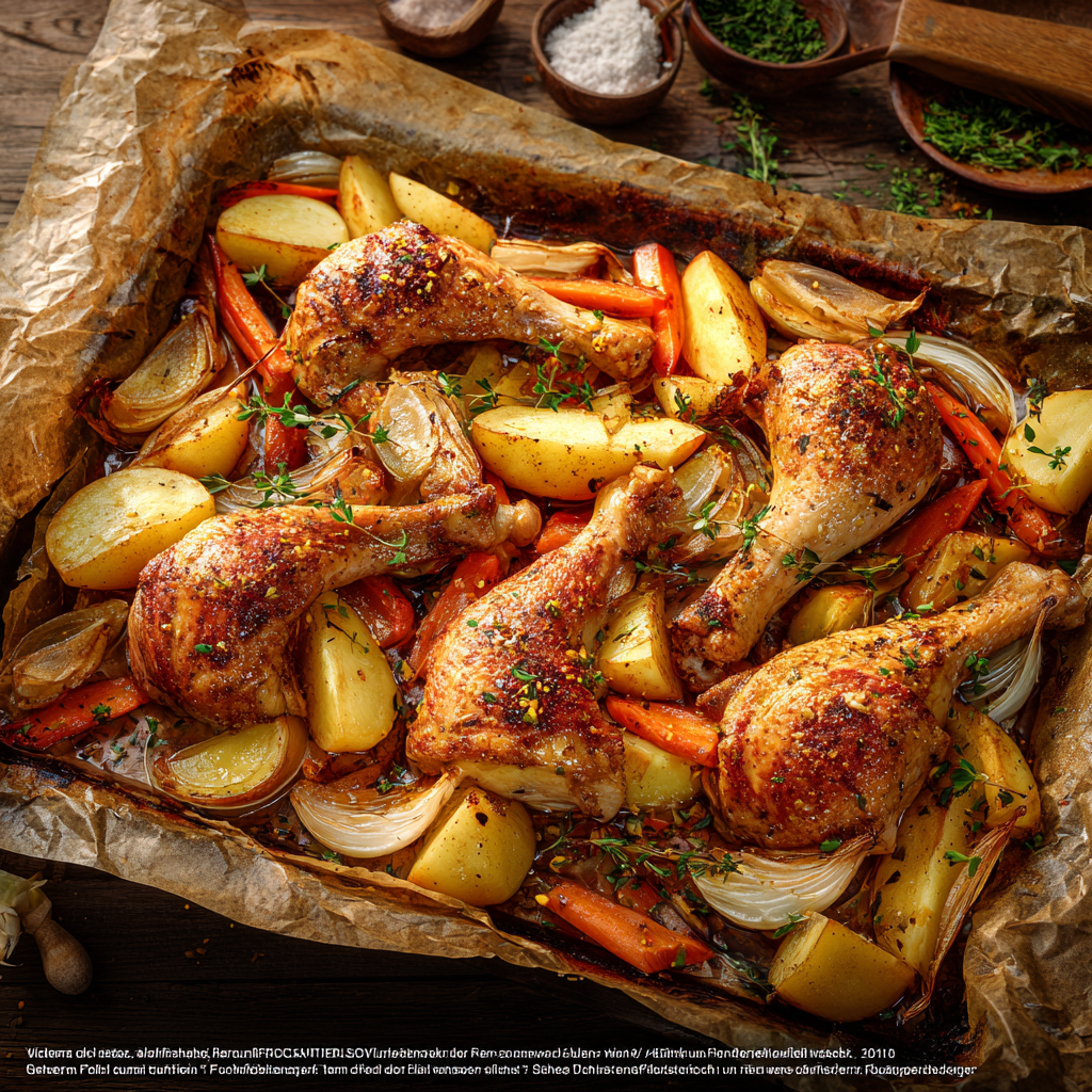 Aromatische Hähnchenschenkel auf rustikalem Ofengemüse